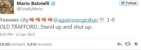 Έτσι μόλις ο Αγουέρο σκόραρε στο μεγάλο ντέρμπι του Ολντ Τράφορντ» έγραψε στο twitter: «Ναι Σίτι, Σέρχιο Αγουέρο !!! 1-0 στο Old Trafford… Σηκωθείτε όρθιοι και… σκάστε».