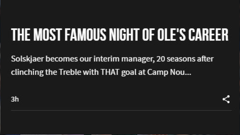 Ωστόσο, η… λεζάντα έκρυβε την είδηση… «Ο Σόλσκιερ γίνεται ο προσωρινός προπονητής της ομάδας μας, 20 χρόνια μετά που σφράγισε το τρεμπλ με εκείνο το γκολ στο Καμπ Νου» έγραφε χαρακτηριστικά.