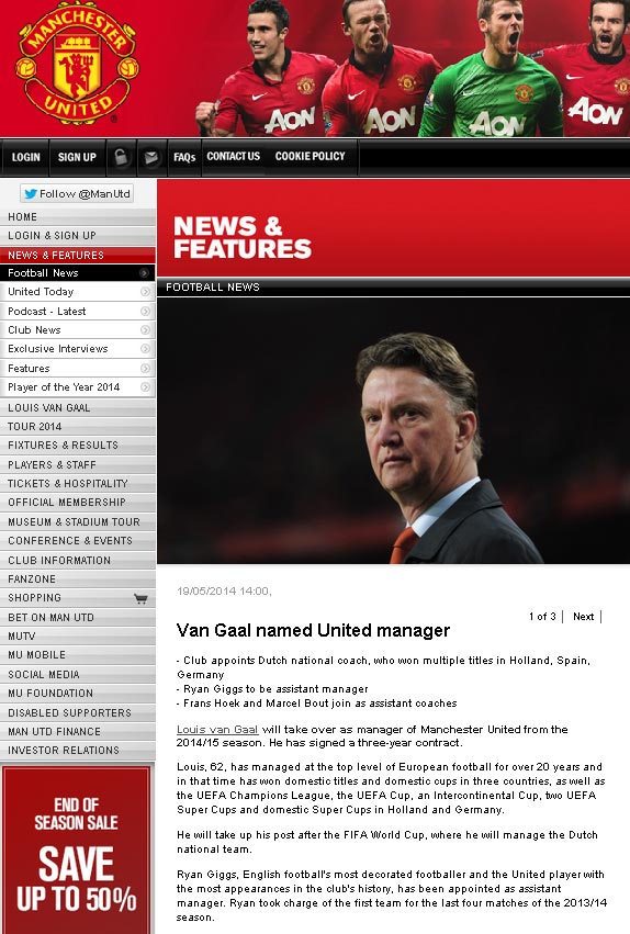 Πλέον ο Φαν Γκάαλ, ο οποίος θα αναλάβει τα νέα καθήκοντά του μετά το Παγκόσμιο Κύπελλο της Βραζιλίας, αναλαμβάνει την αποστολή να επαναφέρει τη Μάντσεστερ Γιουνάιτεντ στον δρόμο των επιτυχιών, από τον οποίο… ξεστράτισε στο διάστημα της παρουσίας του Μόγιες στην τεχνική ηγεσία.