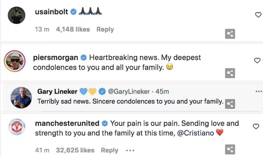 «Ο πόνος σου είναι ο πόνος μας, Κριστιάνο», έγραψαν οι Κόκκινοι Διάβολοι. «Στέλνουμε αγάπη και δύναμη σε σένα και την οικογένειά σου», έγραψε η τρέχουσα ομάδα του Ρονάλντο, Μάντσεστερ Γιουνάιντεντ.