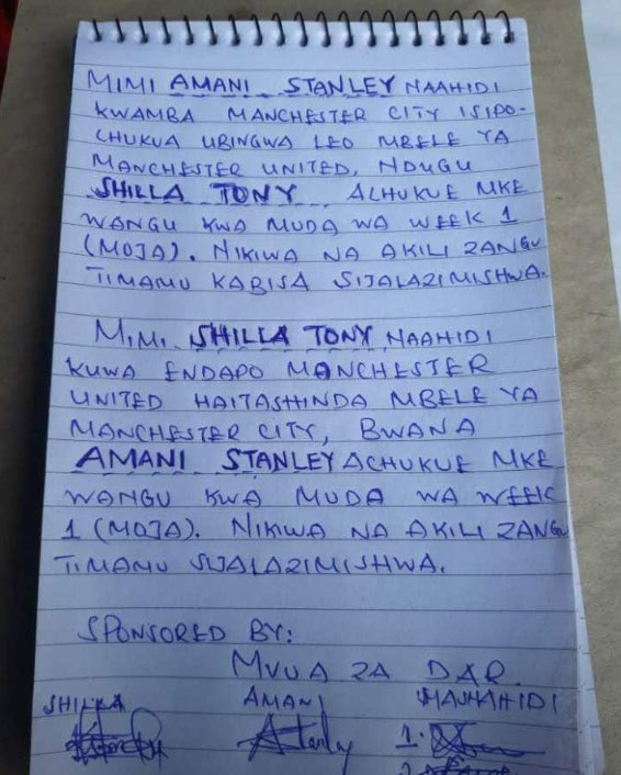 «Εγώ ο Αμάνι Στάνλεϊ υπόσχομαι να δώσω τη σύζυγό μου για μία εβδομάδα στον φίλο μου, τον Τόνι Σίλα, αν η Μάντσεστερ Σίτι δεν κερδίσει την Premier League στο ματς με τη Μάντσεστερ Γιουνάιτεντ. Είμαι απολύτως καλά και δεν αναγκάστηκα από κανέναν σε αυτήν τη συμφωνία» αναφέρει το συμφωνητικό, σύμφωνα με το NairobiNews.