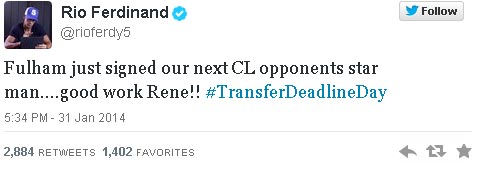 Πιο συγκεκριμένα ο Άγγλος στόπερ έγραψε στο twitter: «Η Φούλαμ μόλις απέκτησε το αστέρι των αντιπάλων μας στο Champions League. Καλή δουλειά Ρενέ».