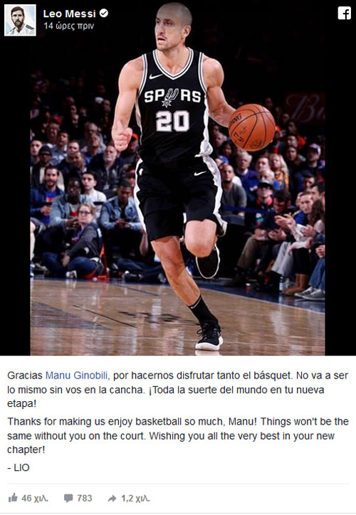 Στο μπασκετικό μεγαλείο του Μανού Τζινόμπιλι υποκλίθηκε, μετά τον Ντιέγκο Αρμάντο Μαραντόνα και ο Λιονέλ Μέσι, μία ημέρα μετά τη γνωστοποίηση της απόφασης του 41χρονου αστέρα των Σαν Αντόνιο Σπερς να εγκαταλείψει την ενεργό δράση.