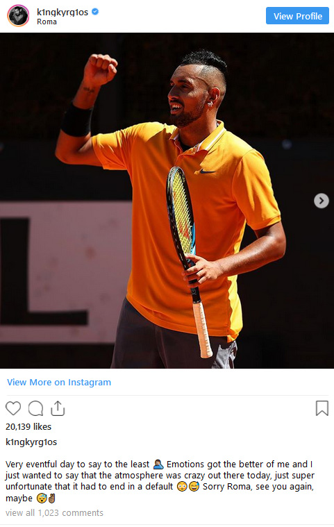 Μετανιωμένος για το ξέσπασμά του κατά τη διάρκεια του αγώνα του με τον Νορβηγό, Κάσπερ Ρουντ για το Open της Ρώμης και την απόφασή του να αποχωρήσει από το κορτ εμφανίστηκε ο Νικ Κύργιος, με μια ανάρτησή του στο instagram.