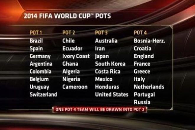 Tα γκρουπ δυναμικότητας των ομάδων που θα συμμετάσχουν στο Μουντιάλ της Βραζιλίας, ενόψει της κλήρωσης, η οποία θα διεξαχθεί την ερχόμενη Παρασκευή, ανακοίνωσε την Τρίτη η FIFA.