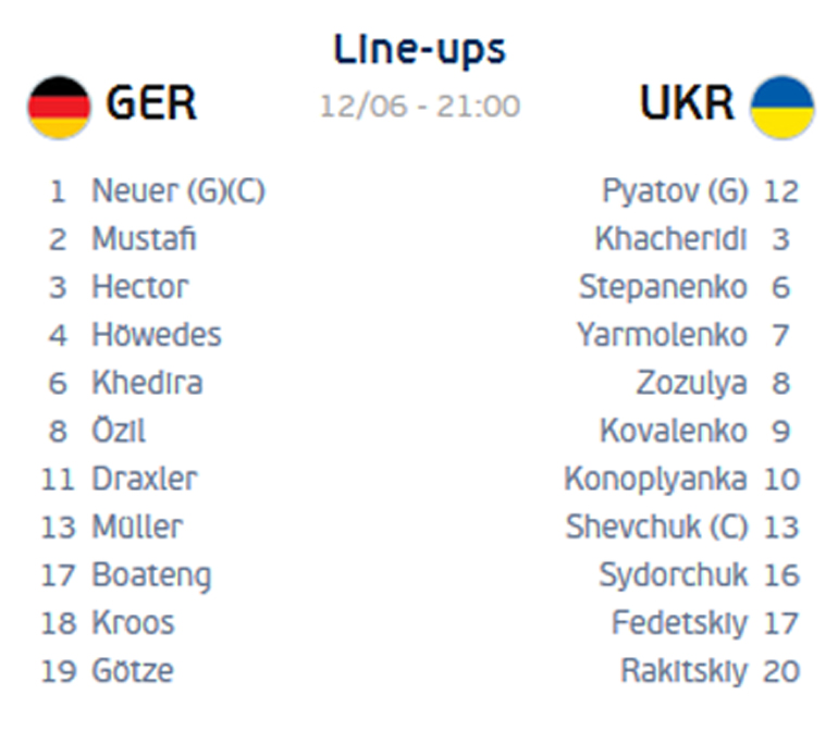 Η Γερμανία είναι το πρώτο σουτ στο ματς με τον Γιούλιαν Ντράξλερ, αλλά την πρώτη καλή ευκαιρία την έχασε η Ουκρανία με το σουτ του Γεβγέν Κονοπλιάνκα να αποκρούει σε κόρνερ ο Μάνουελ Νόιερ.