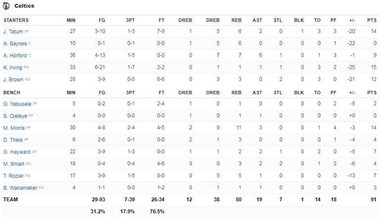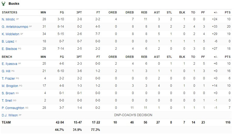 Ο Greek Freak ήταν και πάλι εξαιρετικός. Τελείωσε τον αγώνα με 20 πόντους (4/5 βολές, 8/12 δίποντα, 0/2 τρίποντα), 8 ριμπάουντ, 8 ασίστ, 2 κλεψίματα, 2 τάπες και 4 λάθη σε μόλις 31 λεπτά. Ο Κρις Μίντλετον με 19 και ο Έρικ Μπλέντσο με 18 πόντους τον ακολούθησαν. Αποκαρδιωτική εμφάνιση από τους Σέλτικς, με τον Κάιρι Ίρβινγκ πρώτο σκόρερ μεν με 15 πόντους, αλλά μόλις 6/21 σουτ και 1 ασίστ.
