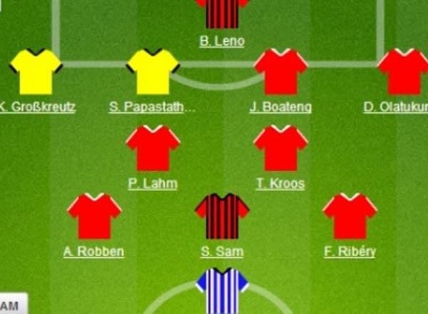 Αναλυτικά η καλύτερη ενδεκάδα της Μπουντεσλίγκα: Λένο (Μπάγερ Λεβερκούζεν), Γκρόσκροϊτς (Μπορούσια Ντόρτμουντ), Παπασταθόπουλος (Μπορούσια Ντόρτμουντ), Μπόατενγκ (Μπάγερν Μονάχου), Αλάμπα (Μπάγερν Μονάχου), Λαμ (Μπάγερν Μονάχου), Κρος (Μπάγερν Μονάχου), Ρόμπεν (Μπάγερν Μονάχου), Σαμ (Μπάγερ Λεβερκούζεν), Ριμπερί (Μπάγερν Μονάχου) και Ράμος (Χέρτα).