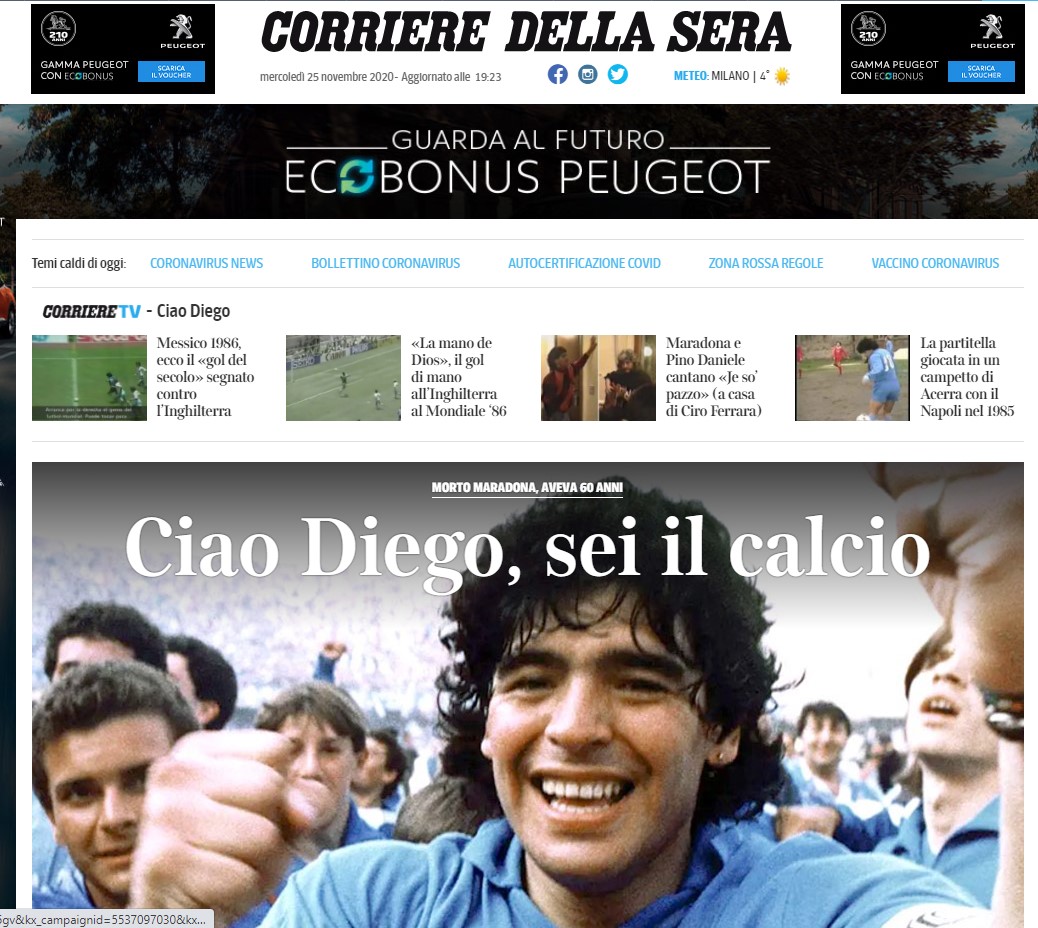Corriere Della Sera: «Aντίο Ντιέγκο, είσαι το ποδόσφαιρο»
