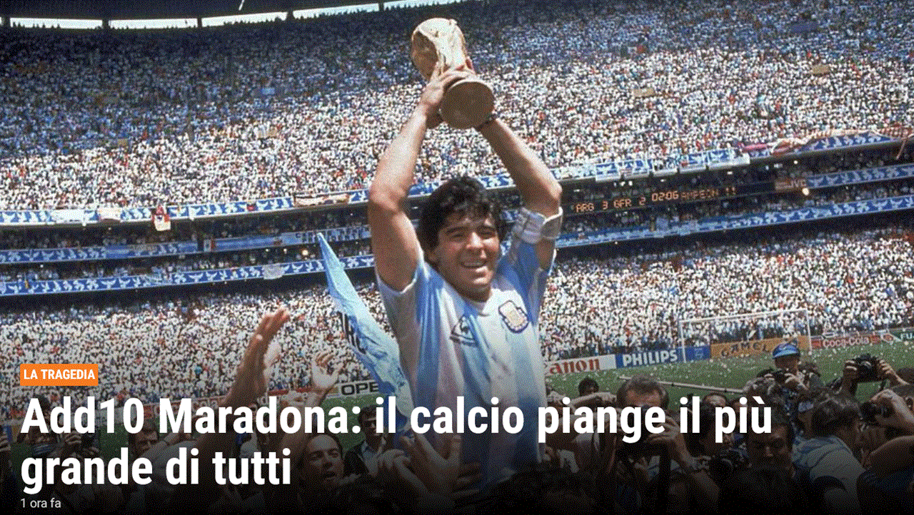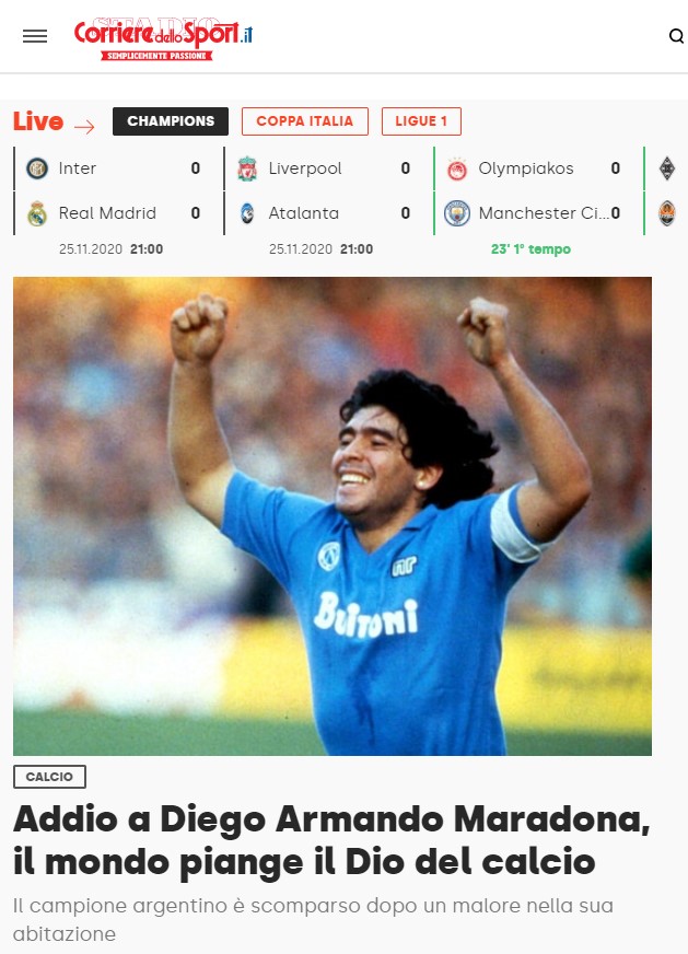 Corriere dello Sport: «Αντίο στον Ντιέγκο Μαραντόνα, ο κόσμος θρηνεί τον Θεό της μπάλας»