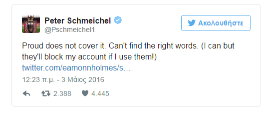 «Η λέξη περηφάνια δεν καλύπτει αυτό που αισθάνομαι. Δεν μπορώ να βρω τις κατάλληλες λέξεις (αν το κάνω, θα μπλοκάρουν τον λογαριασμό μου» έγραψε στο Twitter ο παλαίμαχος τερματοφύλακας.