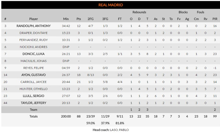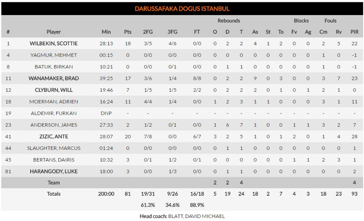 Ο Τζέισι Κάρολ με 21 πόντους (5/8τρ.) πρωταγωνίστησε στη νίκη των Ισπανών. Άξιος συμπαραστάτης του ήταν με 18 πόντους και 9 ριμπάουντ ο Γκουστάβο Αγιόν. Από την Νταρουσάφακα ξεχώρισαν οι Άντε Ζίζιτς (20π.), Σκότι Ουίλμπεκιν (18π.) και Μπραντ Ουαναμέικερ (17π.).