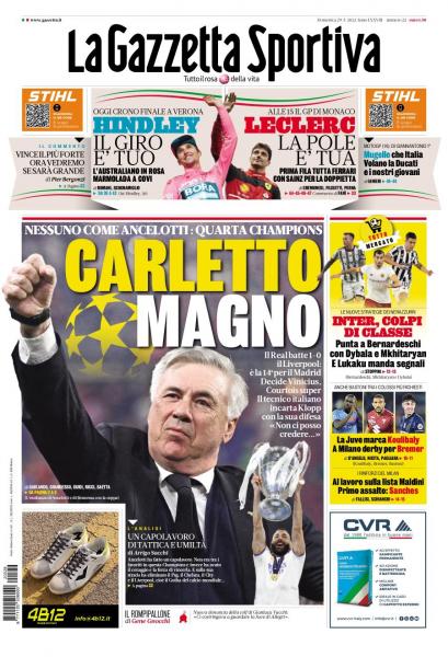 «Μεγάλος Καρλίτο» χαρακτηρίζει η «Gazzetta dello Sport» τον πολυνίκη πλέον της διοργάνωσης Ιταλό κόουτς, ο οποίος πλέον έχει πέντε Champions League.