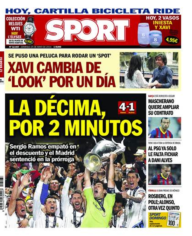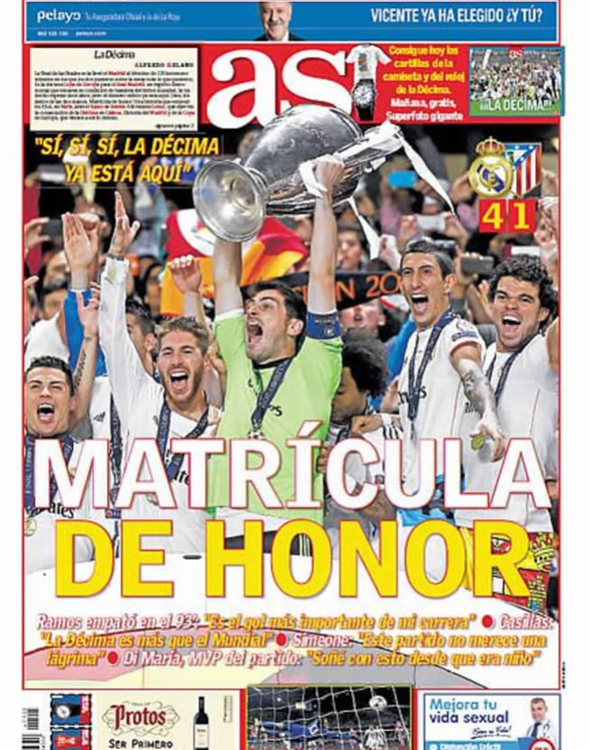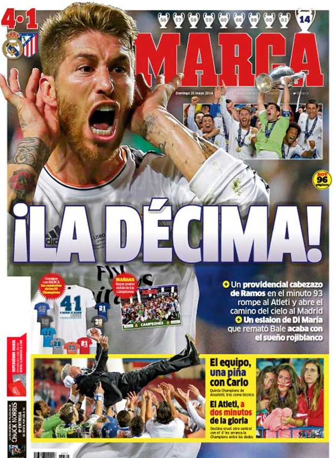 Η λέξη «Decima», που σημαίνει «δέκατο» κυριαρχεί στα πρωτοσέλιδα του ισπανικού Τύπου! Η Ρεάλ επικράτησε 4-1 της Ατλέτικο στον τελικό του Champions League, στη Λισαβόνα και έγραψε ιστορία, καθώς συμπλήρωσε δέκα κούπες Ευρώπης στην πλούσια συλλογή της.