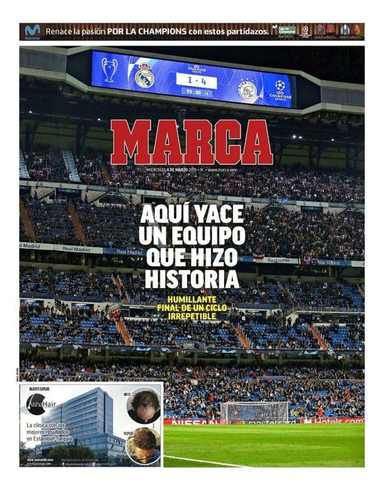 Η Ρεάλ Μαδρίτης έμεινε εκτός συνέχειας του Champions League, μετά την ταπεινωτική ήττα που δέχθηκε από τον Άγιαξ. Η «Marca» με ένα απλό αλλά περιεκτικό πρωτοσέλιδο αποτύπωσε την ουσία και την πραγματικότητα που βιώνει η «βασίλισσα»: