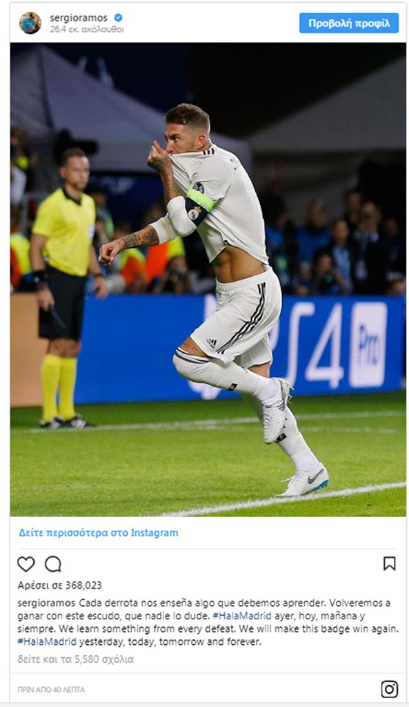Η Ρεάλ Μαδρίτης έχασε από την Ατλέτικο το Σούπερ Καπ Ευρώπης και ο Σέρχιο Ράμος με αφορμή την ήττα έστειλε το μήνυμά του. Ο αρχηγός της «βασίλισσας» έγραψε στο λογαριασμό που διατηρεί στο instagram: