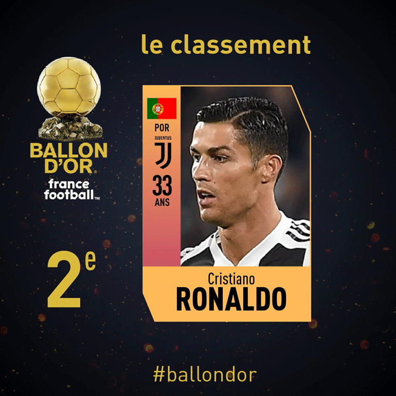 Ο Πορτογάλος σταρ της Γιουβέντους ήταν δεύτερος φέτος, ενώ ο ηγέτης της Μπαρτσελόνα πέμπτος, με τους Αντουάν Γκριζμάν και Κιλιάν Μπαπέ να καταλαμβάνουν αντίστοιχα την τρίτη και τέταρτη θέση.