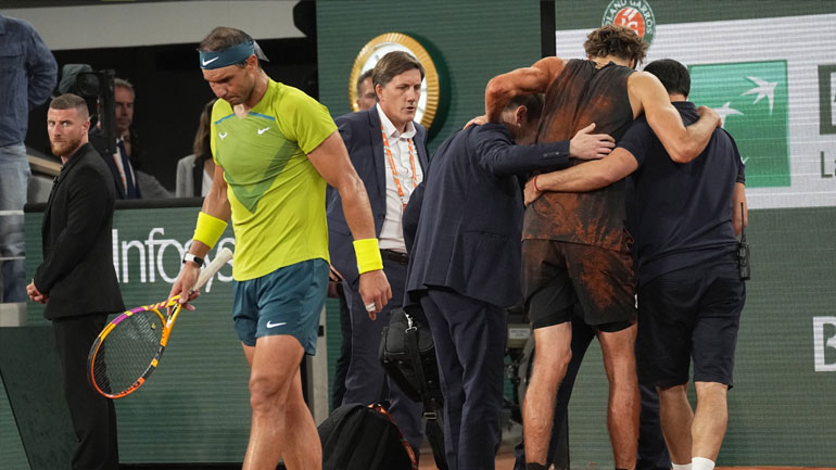 Ο Ζβέρεφ, έκανε μία απότομη αλλαγή κατεύθυνσης (στο 40-30) για να «σώσει» τον πόντο και να μην επιτρέψει στον Ισπανό πρωταθλητή να ισοφαρίσει σε 6-6, οδηγώντας και το δεύτερο σετ σε τάι μπρέικ, με αποτέλεσμα να «γυρίσει» πολύ άσχημα τον αστράγαλο του δεξιού ποδιού του και να σωριαστεί στη χωμάτινη επιφάνεια, ουρλιάζοντας από τους πόνους.
