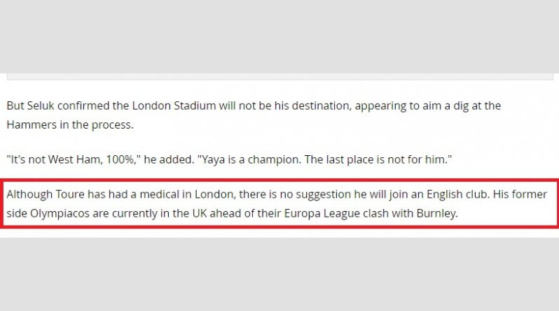 «Αν και ο Τουρέ πέρασε από ιατρικά στο Λονδίνο, δεν είναι σίγουρο ότι θα πάει σε αγγλική ομάδα. Η πρώην ομάδα του, ο Ολυμπιακός είναι στο Ηνωμένο Βασίλειο για το ματς του Europa League με την Μπέρνλι» ανέφερε με νόημα το συγκεκριμένο δημοσίευμα.