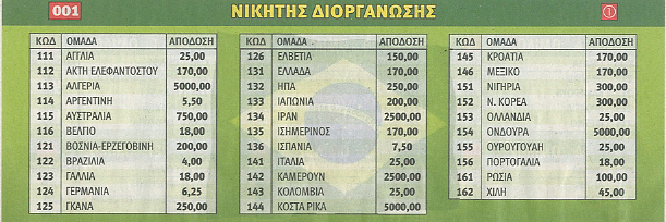 Όσον αφορά στην Εθνική μας ομάδα, το ενδεχόμενο να κάνει το «θαύμα» στη χώρα της σάμπα και να σηκώσει το τρόπαιο, πληρώνει 170.