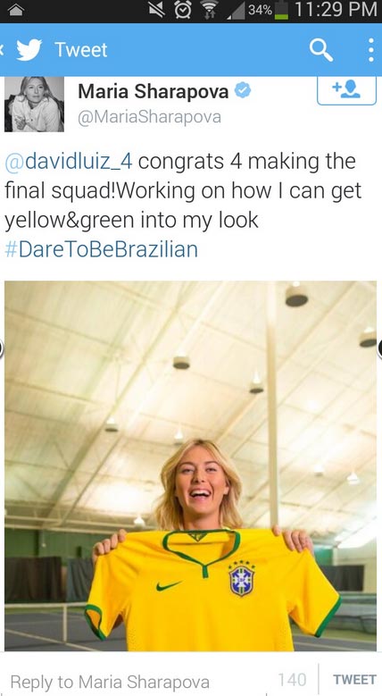 Η Ρωσίδα καλλονή, με αφορμή λοιπόν την κλήση του 27χρονου αμυντικού μέσου στην 23άδα της «σελεσάο» για το Μουντιάλ της Βραζιλίας, έγραψε στον προσωπικό της λογαριασμό στο twitter: «Νταβίντ Λουίζ συγχαρητήρια που είσαι στην τελική ομάδα! Δουλεύω στο πώς θα ταιριάξω το κίτρινο και το πράσινο στο λουκ μου. Τόλμησε να είσαι Βραζιλιάνος».