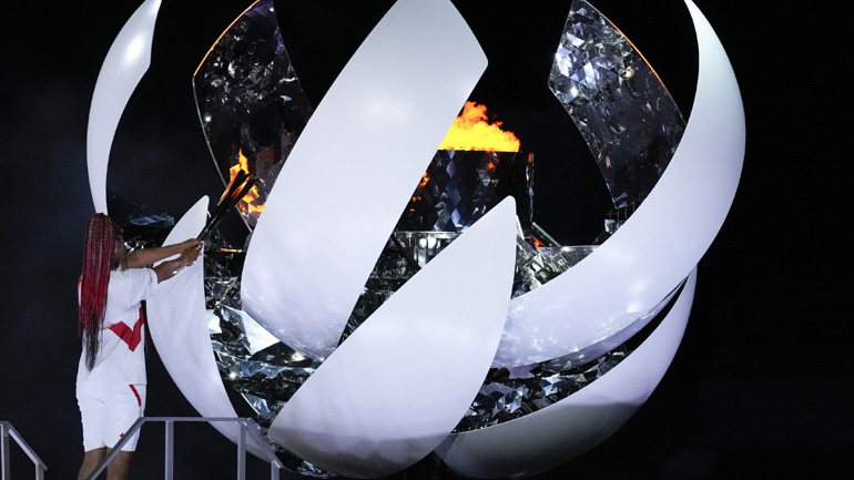 Τα παιδιά κράτησαν για λίγο το καθένα την Ολυμπιακή Φλόγα και την παρέδωσαν στη Ναόμι Οσάκα, ίσως την πλέον αναγνωρίσιμη παγκοσμίως αθλήτρια της Ιαπωνίας. Η 23χρονη τενίστρια ανέβηκε αργά-αργά τα σκαλιά προς τον Βωμό, ο οποίος αποκαλύφθηκε μέσα από μία σφαίρα, και μεταλαμπάδευσε το φως της Ιερής Φλόγας, δίνοντας το σύνθημα για την έναρξη των πιο παράξενων Ολυμπιακών Αγώνων της ιστορίας.