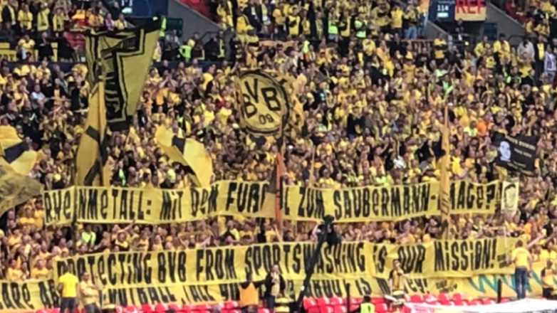 Σε πανό το μήνυμα-αντίδραση των φιλάθλων της Ντόρτμουντ για την απόφαση της διοίκησης του γερμανικού συλλόγου να υπογράψει χορηγική συμφωνία με εταιρία κατασκευής όπλων και πυρομαχικών. «Αποστολή μας να προστατεύσουμε την Μπορούσια Ντόρτμουντ από το αθλητικό ξέπλυμα» έγραφε το πανό των υποστηρικτών της γερμανικής ομάδας