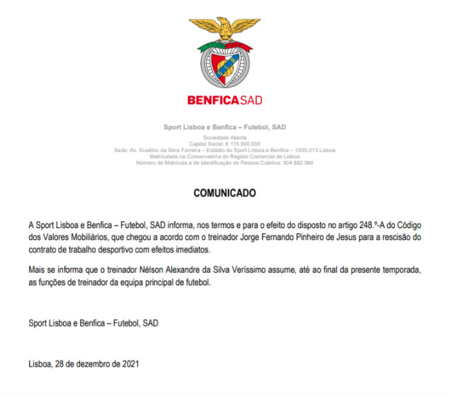 Παρελθόν αποτελεί και επίσημα από την Μπενφίκα ο Ζόρζε Ζεσούς, καθώς την Τρίτη οι «αετοί» της Λισαβόνας ανακοίνωσαν τη λύση της συνεργασίας τους με τον 67χρονο προπονητή.
