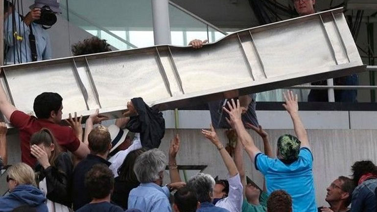 Το πάνελ έπεσε πάνω στους θεατές, δίχως ευτυχώς να τραυματιστεί κανείς σοβαρά. Ένας θεατής πάντως έκοψε το χέρι του στην προσπάθεια του να σηκώσει το πάνελ, το οποίο είχε καρφιά στις άκρες του.