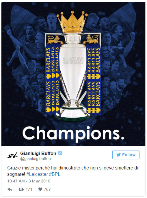 Ο Τζίζτι Μπουφόν έστειλε το δικό του μήνυμα στον άνθρωπο της χρονιάς για το ευρωπαϊκό ποδόσφαιρο, Κλαούντιο Ρανιέρι, μέσω Twitter και τον αποθέωσε.