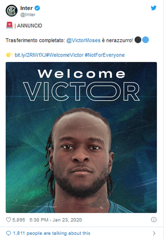 Παίκτης της Ίντερ είναι κι επίσημα από την Πέμπτη ο Βίκτορ Μόουζες.