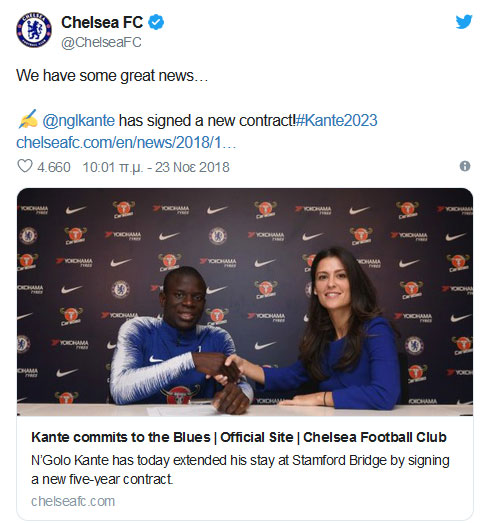 Με τη φανέλα της Τσέλσι θα συνεχίσει να αγωνίζεται ο Ενγκολό Καντέ, καθώς, όπως ανακοινώθηκε το πρωί της Παρασκευής από την Τσέλσι, επέκτεινε τη συνεργασία του με τους Λονδρέζους μέχρι το 2023.
