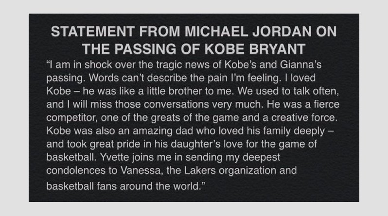 Συντετριμμένος από τον θάνατο του Κόμπι Μπράιαντ είναι ο Μάικλ Τζόρνταν, ο οποίος έστειλε το δικό του αποχαιρετιστήριο μήνυμα στον θρύλο των Λος Άντζελές Λέικερς.