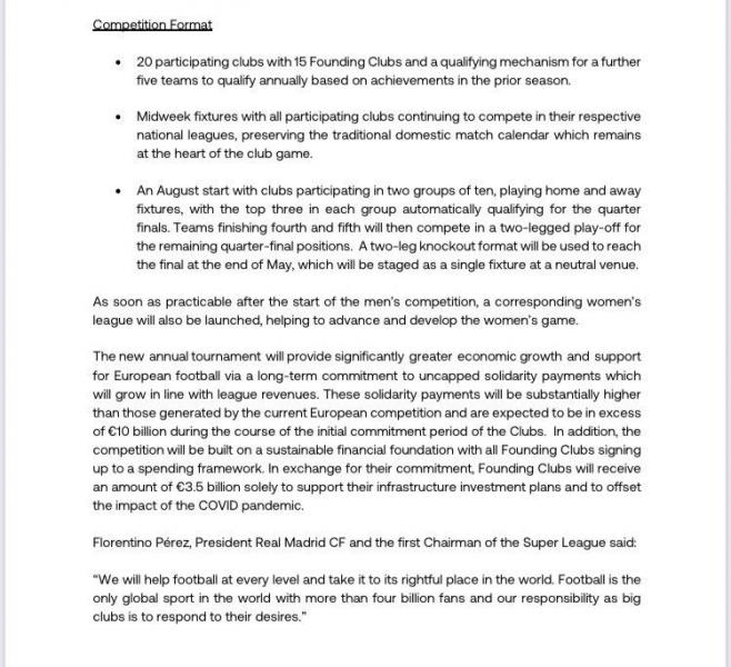 «Η UEFA, η αγγλική ποδοσφαιρική ομοσπονδία και η Premier League, η ισπανική ποδοσφαιρική ομοσπονδία (RFEF) και η LaLiga, και η ιταλική ποδοσφαιρική ομοσπονδία (FIGC) και η Lega Serie A πληροφορήθηκαν ότι κάποιοι αγγλικοί, ισπανικοί και ιταλικοί σύλλογοι ίσως σχεδιάζουν τη δημιουργία μίας κλειστής, αποκαλούμενης Super League.
