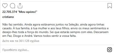 Στο συγκινητικό του μήνυμα στο Instagram για τον νεόνυμφο Ντιόγκο Ζότα και τον αδελφό του, ο Ρονάλντο έγραψε: «Δεν βγάζει κανένα νόημα. Μόλις πριν λίγο ήμασταν μαζί στην Εθνική, μόλις παντρεύτηκες. Στην οικογένειά σου, στη γυναίκα σου και στα παιδιά σου στέλνω τα συλλυπητήριά μου και όλη τη δύναμη του κόσμου. Ξέρω ότι θα είσαι πάντα μαζί τους. Αναπαυθείτε εν ειρήνη Ντιόγκο και Αντρέ. Όλοι θα σας θυμόμαστε».