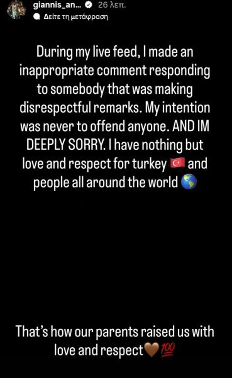 «Στην ζωντανή μετάδοση έκανα ένα ανάρμοστο σχόλιο απαντώντας σε κάποιον που έδειξε ασέβεια. Η πρόθεση μου δεν ήταν ποτέ να προσβάλλω κανέναν. Και λυπάμαι βαθύτατα. Δεν έχω τίποτα άλλο πέρα από σεβασμό και αγάπη για την Τουρκία και όλο τον κόσμο. Έτσι μας μεγάλωσαν οι γονείς μας. Με αγάπη και σεβασμό».