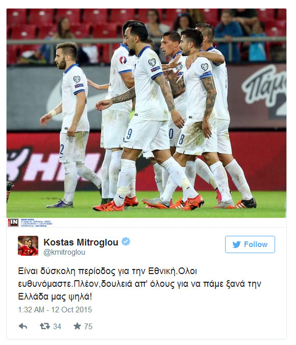«Είναι δύσκολη περίοδος για την εθνική. Όλοι ευθυνόμαστε. Πλέον, δουλειά απ’ όλους για να πάμε ξανά την Ελλάδα μας ψηλά!» έγραψε ο διεθνής φορ στη σελίδα του στο Twitter, αναρτώντας και την παρακάτω φωτογραφία.