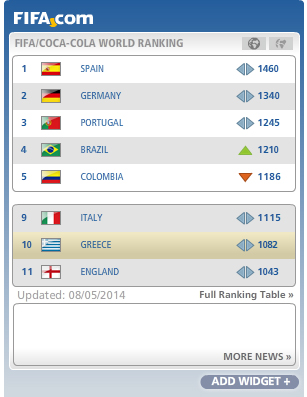 Σταθερή στην 10η θέση στην λίστα με την παγκόσμια κατάταξη των Εθνικών ομάδων έμεινε η Ελλάδα για τον μήνα Μάιο, ανακοίνωσε η FIFA. Το αντιπροσωπευτικό μας συγκρότημα έχει συγκομιδή 1082 βαθμούς!