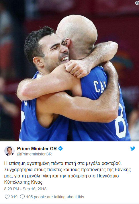 “Η επίσημη αγαπημένη πάντα πιστή στα μεγάλα ραντεβού. Συγχαρητήρια στους παίκτες και τους προπονητές της Εθνικής μας, για τη μεγάλη νίκη και την πρόκριση στο Παγκόσμιο Κύπελλο της Κίνας” αναφέρει στον προσωπικό του λογαριασμό στο twitter ο πρωθυπουργός Αλέξης Τσίπρας.