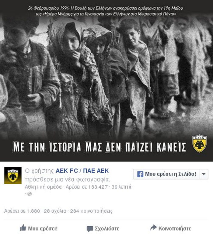 Με τίτλο «Με την ιστορία μας δεν παίζει κανείς», η ΠΑΕ ανήρτησε μια φωτογραφία στην επίσημη σελίδα της στο Facebook, θυμίζοντας πως η γενοκτονία των Ποντίων έχει αναγνωριστεί από την ελληνική Βουλή, αφήνοντας σαφείς αιχμές κατά του Νίκου Φίλη.