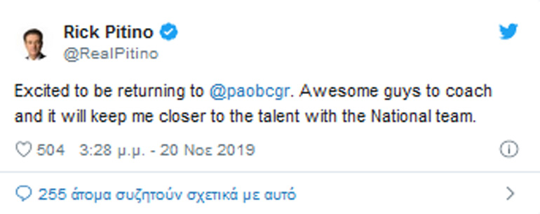 Υπενθυμίζεται ότι ο Πιτίνο ανέλαβε τον Παναθηναϊκό μεσούσης της περυσινής σεζόν και ήταν η πρώτη ομάδα που καθοδήγησε στην Ευρώπη.