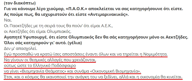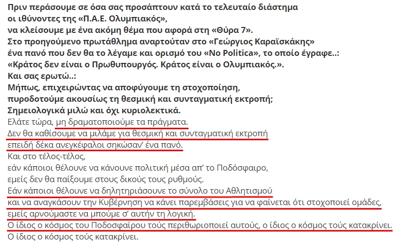 «Κράτος δεν είναι ο Πρωθυπουργός. Κράτος είναι ο Ολυμπιακός.»,