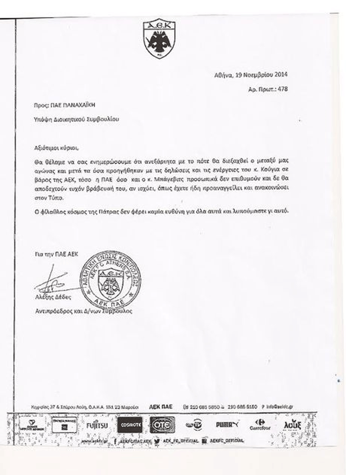 Η κίνηση της ΑΕΚ προκάλεσε εκνευρισμό στην Παναχαϊκή, κάτι που φαίνεται από την ανακοίνωση που ανάρτησε η αχαϊκή ομάδα στην επίσημη ιστοσελίδα της, δημοσιεύοντας την επιστολή με τη λεζάντα: