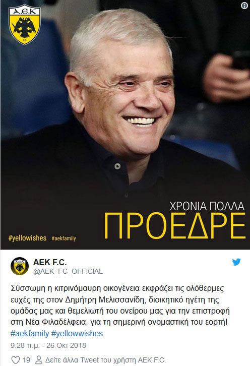«Σύσσωμη η κιτρινόμαυρη οικογένεια εκφράζει τις ολόθερμες ευχές της στον Δημήτρη Μελισσανίδη, διοικητικό ηγέτη της ομάδας μας και θεμελιωτή του ονείρου μας για την επιστροφή στη Νέα Φιλαδέλφεια, για τη σημερινή ονομαστική του εορτή!» ήταν το μήνυμα με το οποίο η ΑΕΚ έστειλε τις ευχές της στον ισχυρό άνδρα της ΠΑΕ.