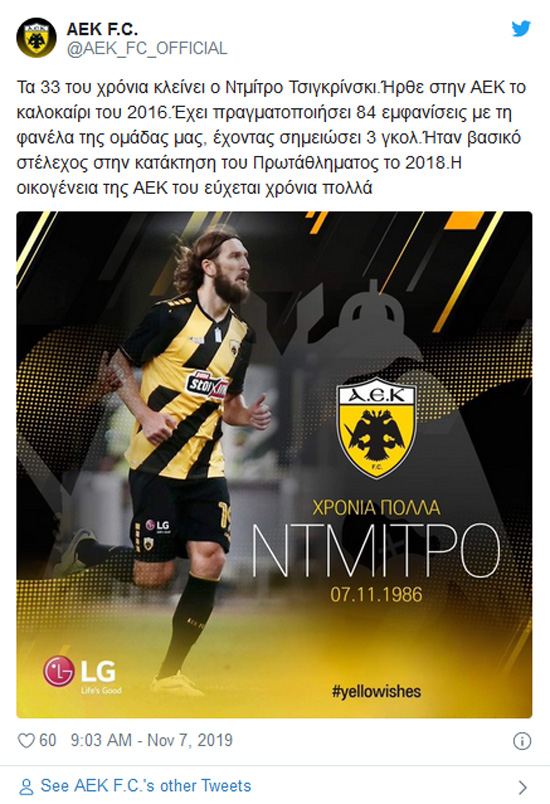 «Τα 33 του χρόνια κλείνει ο Ντμίτρο Τσιγκρίνσκι. Ήρθε στην ΑΕΚ το καλοκαίρι του 2016. Έχει πραγματοποιήσει 84 εμφανίσεις με τη φανέλα της ομάδας μας, έχοντας σημειώσει 3 γκολ. Ήταν βασικό στέλεχος στην κατάκτηση του πρωταθλήματος το 2018. Η οικογένεια της ΑΕΚ του εύχεται χρόνια πολλά» αναφέρει στο ευχετήριο μήνυμά της η «Ένωση».