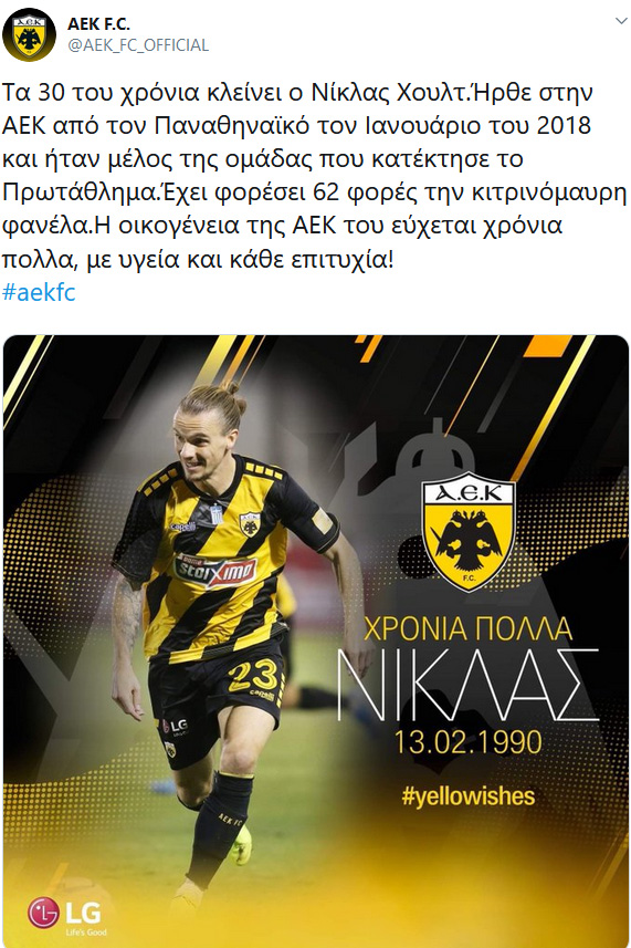 «Τα 30 του χρόνια κλείνει ο Νίκλας Χουλτ. Ήρθε στην ΑΕΚ από τον Παναθηναϊκό τον Ιανουάριο του 2018 και ήταν μέλος της ομάδας που κατέκτησε το Πρωτάθλημα. Έχει φορέσει 62 φορές την κιτρινόμαυρη φανέλα. Η οικογένεια της ΑΕΚ του εύχεται χρόνια πολλά, με υγεία και κάθε επιτυχία» ανέφεραν στην ευχετήρια ανάρτησή τους οι «κιτρινόμαυροι».