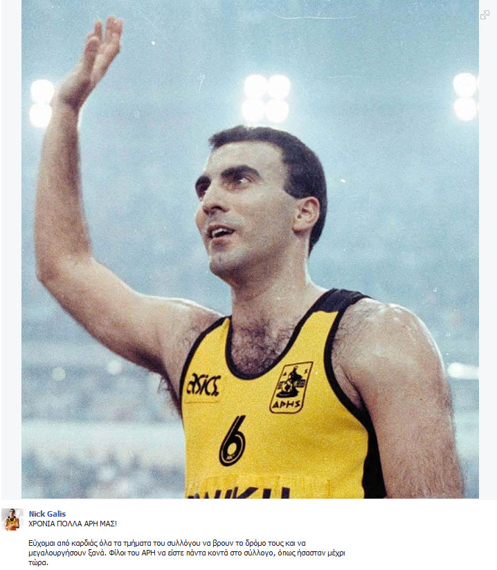 Ο Άρης συμπληρώνει σήμερα, 25η Μαρτίου του 2015, τα 101 χρόνια από την ίδρυσή του. Ο αθλητής που άφησε το στίγμα του περισσότερο από οποιονδήποτε άλλο στην ιστορία του συλλόγου, ο μεγάλος Νίκος Γκάλης, έστειλε τις ευχές του για τα γενέθλεια της ομάδας, μέσω Facebook.