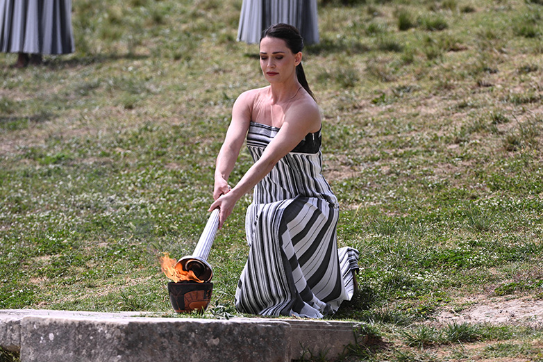 Η Τελετή, με παρουσιαστή τον Νίκο Αλιάγα και εμπνευσμένη από την αρχαιότητα, πραγματοποιήθηκε, παρουσία της Προέδρου της Ελληνικής Δημοκρατίας, Κατερίνας Σακελλαροπούλου, στην Αρχαία Ολυμπία, σύμφωνα με το παραδοσιακό τελετουργικό, ξανά με πλήθος κόσμου μετά από δύο διοργανώσεις που έχασαν τη μεγάλη «λάμψη» τους, εξαιτίας των περιορισμών που συνδέονται με την πανδημία της Covid-19, ήτοι τους Θερινούς Ολυμπιακούς Αγώνες του Τόκιο το 2021 και τους Χειμερινούς Ολυμπιακούς του Πεκίνου το 2022.