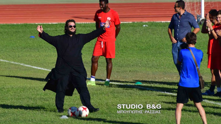 Πιο συγκεκριμένα, μετά τον αγιασμό του συλλόγου ο ιερέας, Κωνσταντίνος Σέρρος σκόραρε από το σημείο του πέναλτι πανηγυρίζοντας δεόντως το γκολ που πέτυχε, υπό τα χειροκροτήματα όσων βρέθηκαν στο δημοτικό αθλητικό κέντρο Ναυπλίου, ενώ ακολούθως (απ)έδειξε σε όλους την υψηλή του τεχνική με την μπάλα στα πόδια.
