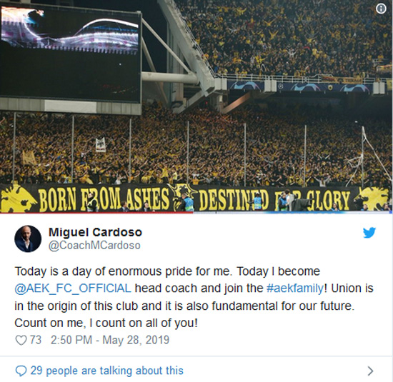 «Σήμερα είναι μια μέρα τεράστιας περηφάνιας για εμένα. Σήμερα έγινα προπονητής της ΑΕΚ και μπήκα στην οικογένειά της. Η ενότητα είναι χαρακτηριστικό αυτού του συλλόγου και επίσης θεμελιώδης για το μέλλον μας. Βασιστείτε σε εμένα, βασίζομαι σε εσάς», έγραψε χαρακτηριστικά ο Καρντόσο.